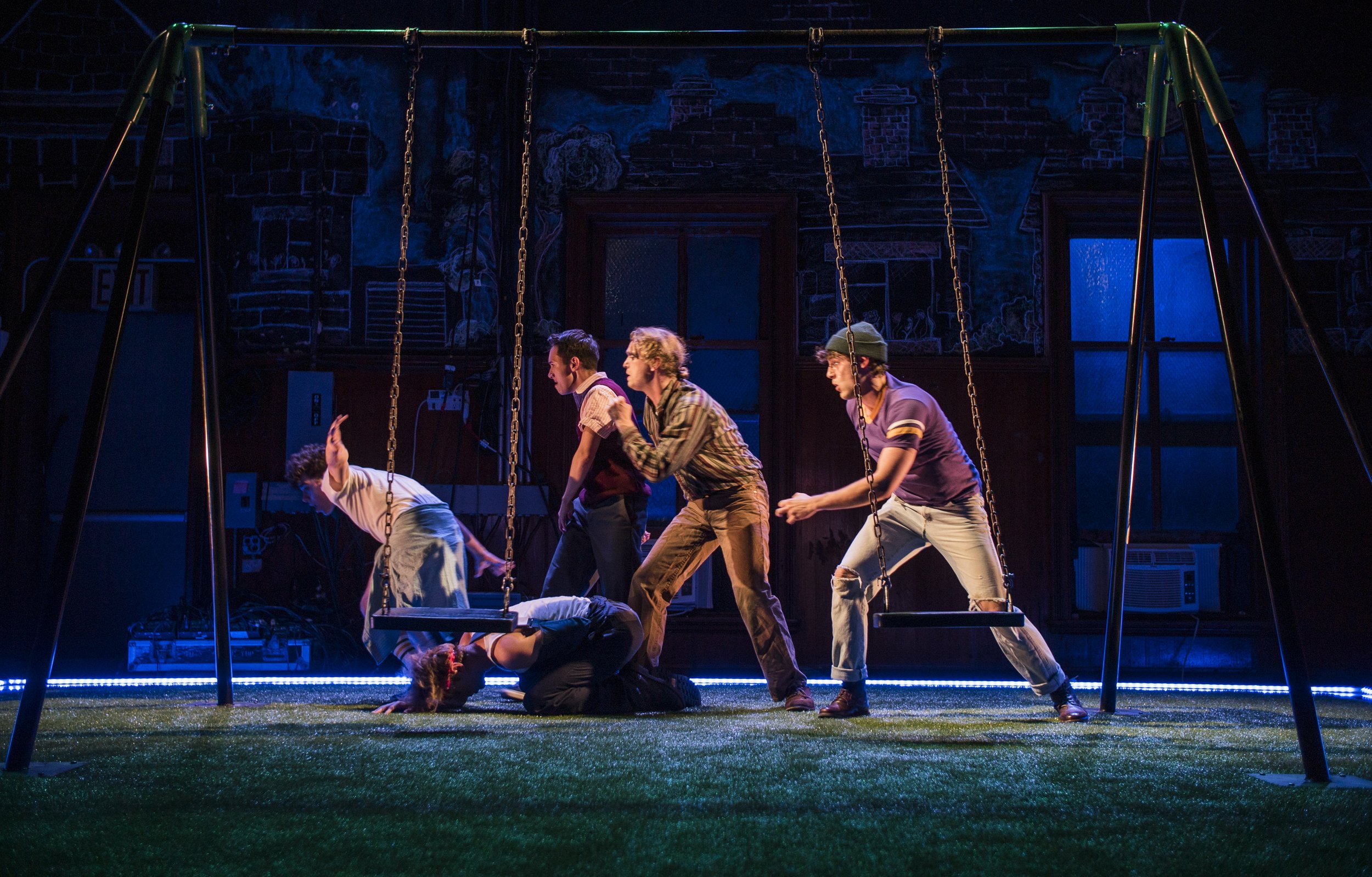 Decky Does A Bronco by Douglas Maxwell is the tragically comedic story of a crew of nine-year-old boys who spend the summer of 1983 together; it is retold as a memory play by David, one of the boys of the crew who is now an adult. Doing a Bronco, which is the act of working the swing up while standing on it and then kicking it over the top bar of the swing set, is the social benchmark for young boys at the time. It is a dangerous mixture of both athleticism and vandalism (needing someone of adult height to bring it back down). Decky, the smallest of the bunch and the only one who cannot Bronco, is determined to climb the social ranks by finally completing the stunt for the first time. As an adult, David recounts the disastrous event of that summer which ultimately robbed the crew of their innocence as children and continues to haunt them as adults to this day.